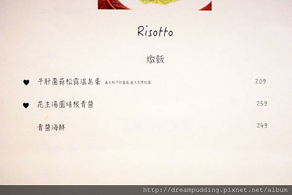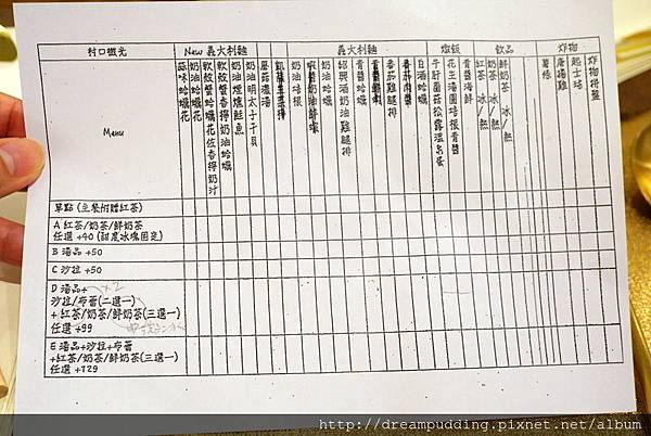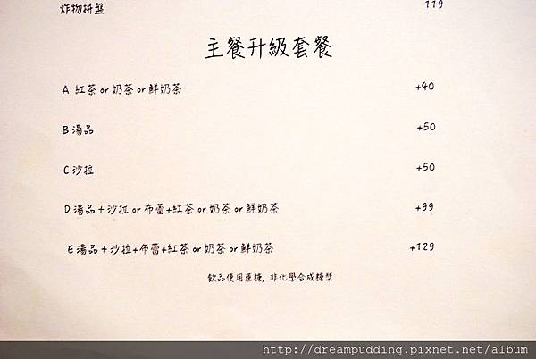 主要販售義大利麵跟燉飯,加價套餐選項有5種,可視當天情況點選加購升級。