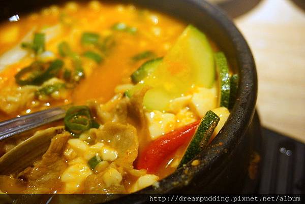 大醬豆腐煲,主要內容物為豬肉、節瓜、金針菇,採用韓國大醬下去製作湯底,因此會帶點溫潤的微辣。