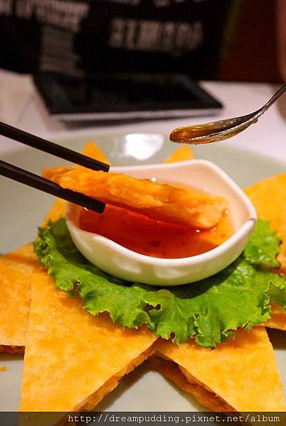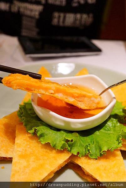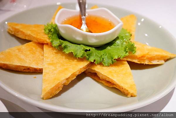 瓦城的月亮蝦餅是好吃的,餅皮薄中帶點脆,熱度很有,內餡吃得到蝦肉,口感新鮮飽滿。