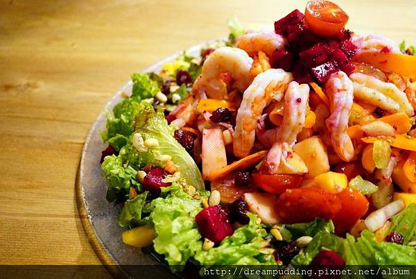 內容物十分豐富,有新鮮的蝦子跟許多水果丁及生菜,泰式醬汁酸辣開胃帶有食材的清脆感,完美的開端。