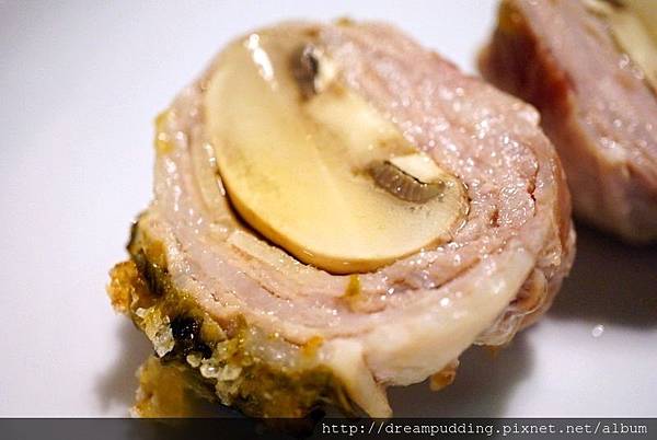 層層豬肉裡包了一顆碩大的蘑菇,切開有汁,濃郁帶鮮美,很棒。