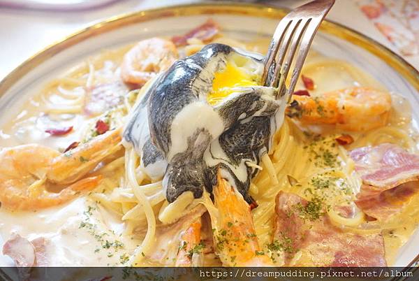 白醬本就濃郁,搭配半熟水波蛋,口感更加稠滑,蝦子有新鮮,麵體也略帶Q彈,整體吃下來,飽足感很夠。
