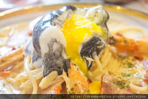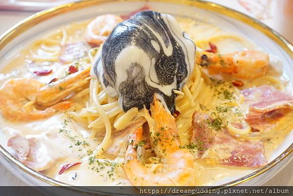 為白醬口味,搭配大理石起士醬水波蛋以及蝦子還有培根。