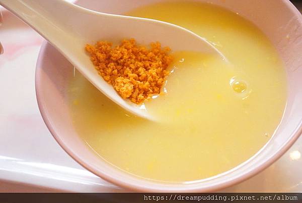 鮭蜜濃湯,鮭魚鹹度較高,所以記得要攪散搭配濃湯一塊。