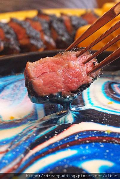 牛肉採用舒肥方式料理,口感上雖沒有香煎來的多汁,但口感上比較軟嫩,可以搭配一旁附的蒜末或是玫瑰鹽。