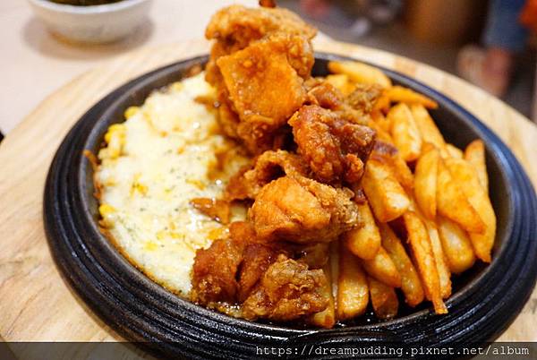 有剛炸好的香酥帶肉汁的炸雞跟熱呼呼的薯條,沾附有著香甜玉米粒的起士,一整個非常濃郁;是說這道可要趁熱吃,不然涼了之後會有點油膩。