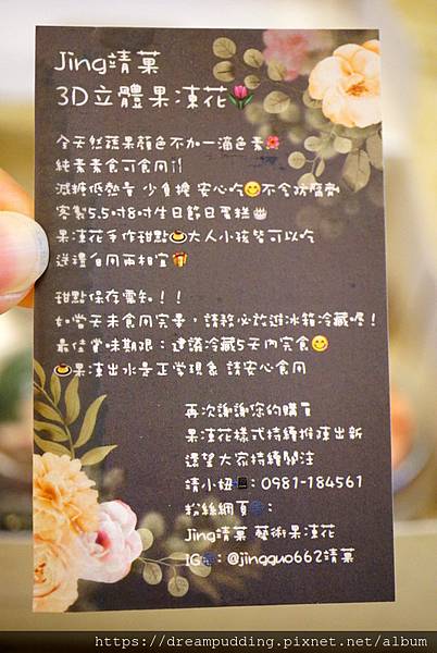 第一次吃果凍花蛋糕,嚐起來很清爽,口味上也是舒服的微甜,如果不愛鮮奶油的厚重蛋糕,可以嚐嚐這清新自然的果凍花蛋糕喔!靖菓的果凍花蛋糕為客製化,有想要的圖案或是造型可以跟闆娘討論^^