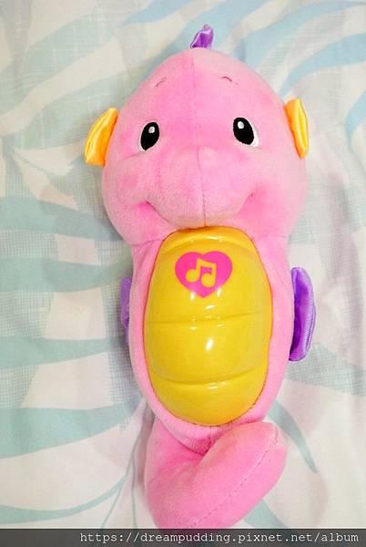Fisher-Price費雪聲光安撫海馬有許多款式,現在有很多不同造型,很多通路都有賣,價格上也不會落差太大,我是在麗兒采家買的。海馬上的絨毛是短毛,所以也不用擔心會會被寶寶吃到毛屑;內建8首輕柔音樂,有模擬大海類似媽媽肚子裡羊水波動的聲音,漸暗式的暖黃燈光,很有療癒效果。