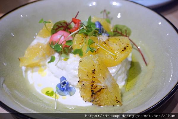 絲綢起司就是布拉塔起司,牽絲的起司口感滑順,搭配炭烤過後的柳橙,帶有甜美汁液,好清爽。