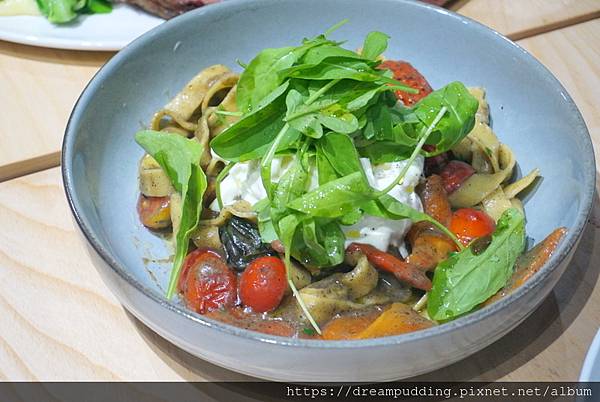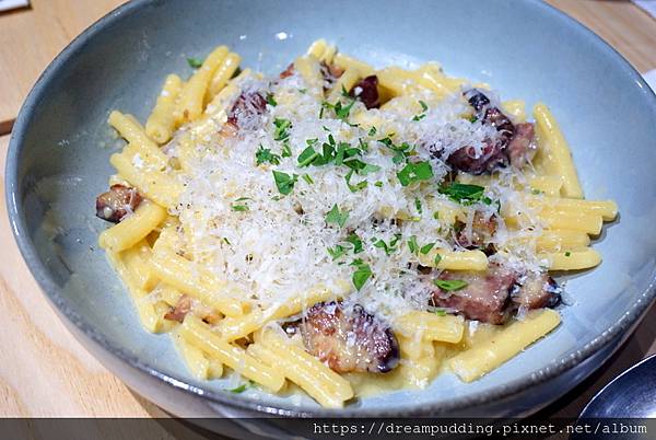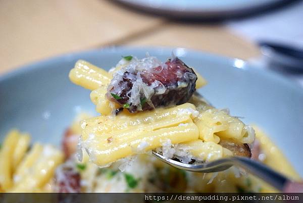 採用布拉塔起司,搭配手工義大利麵,口感濃郁,麵體彈Q帶嚼勁。