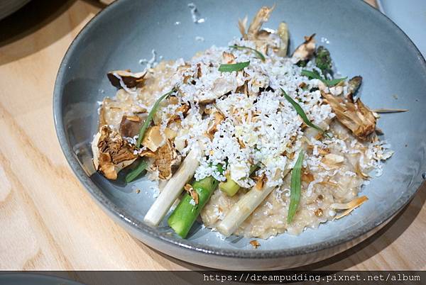 採用野菇、姬松茸跟蘆筍及糙米下去熬煮燉飯,口感很有,味道濃郁。