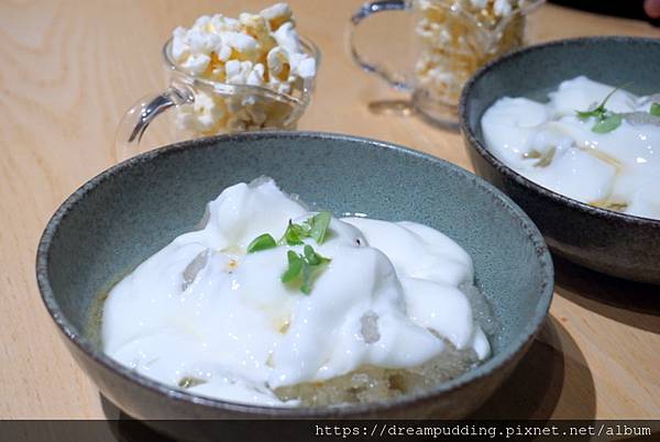 採用生乳、桂花蜜、楓糖跟爆米花,像是微微凝固的牛奶,奶香味濃郁口感又細緻。