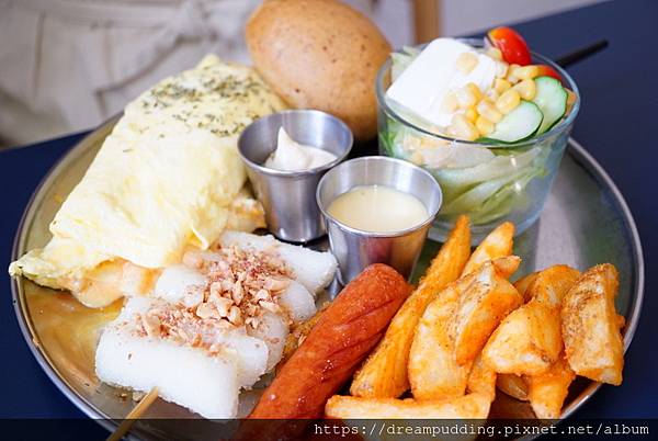 內容物很豐盛,有蛋捲、麵包、沙拉、薯條、德式香腸、年糕串。