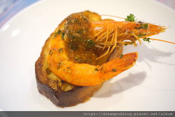 香蒜麵包炸的些些微油,但是口感很酥,蝦子新鮮,那個醬濃郁好吃。