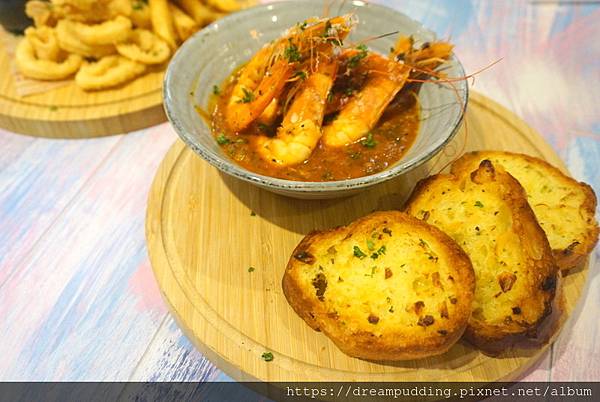 瑪格麗特鮮蝦盅附香蒜麵包,NT 280元。