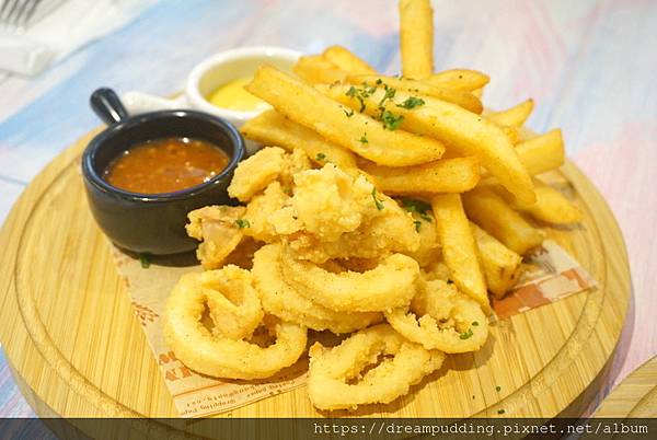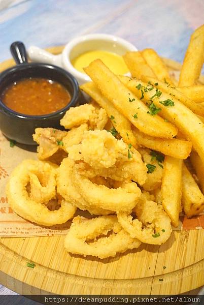 除了炸烏賊之外還有薯條,醬料紅色是會辣的醬,黃色是甜潤的蜂蜜芥末醬。炸的外酥內有嚼勁,新鮮不油膩,如果烏賊再多一些就更好了>////<