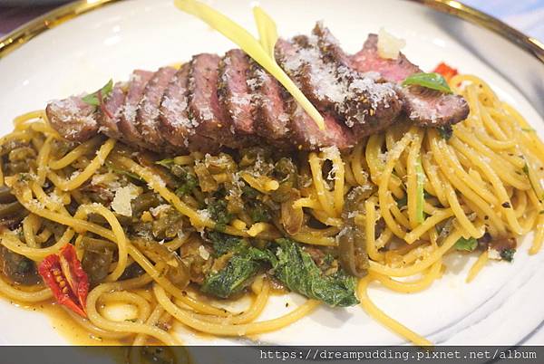 剝皮辣椒菲力清炒義大利麵,NT 320元。