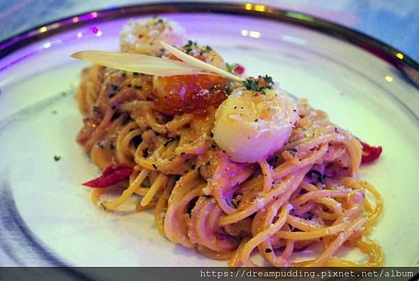 干貝鮭魚卵佐明太子奶油醬義大利麵,NT 420元。