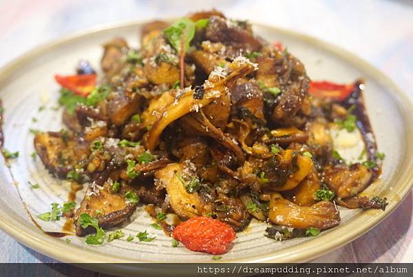 綜合香料炒菇佐巴薩米克醋,NT 160元。