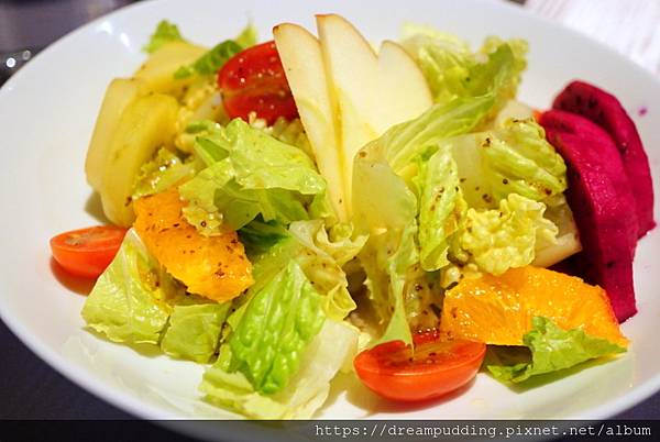生菜水果沙拉,生菜鮮脆,水果又甜,醬汁微酸清爽,讓我打算還要再加點,結果吃到後面,飽到完全沒辦法再回來加點他@@