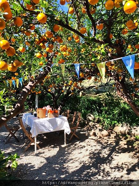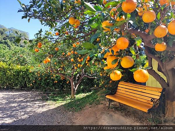 園區許多橘子樹下都擺放了長椅,可不同樹下的椅子,拍出來都是很美的景色。