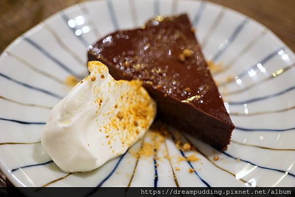 加入了威士忌下去製作,酒香明顯且迷人,跟巧克力混搭,整體有層次且細緻,一旁的鮮奶油輕盈蓬鬆,增加一絲甜蜜感。