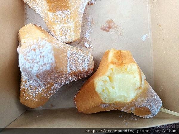 熱呼呼的消波塊用紙盒裝著,外皮微微的酥薄,內餡蓬鬆帶軟,搭上香甜潤的卡士達內餡,甜度恰好。