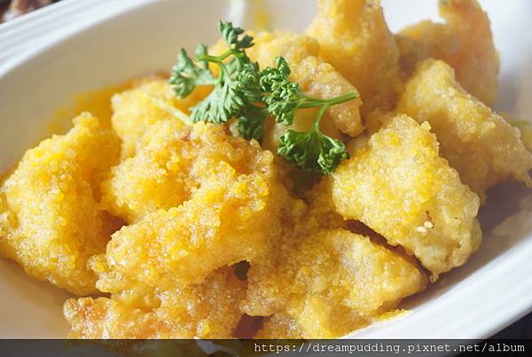 碩大的新鮮蝦球裹上微沙微潤的鹹蛋黃,口感熱燙又Q彈,好吃。