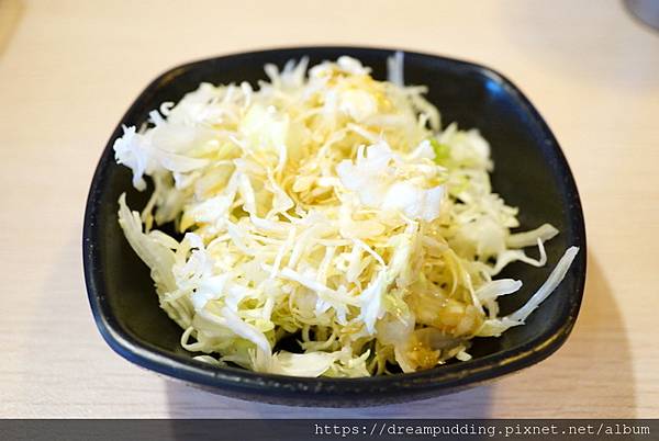 高麗菜絲也是可以無限續加的,口感爽脆,有胡麻醬跟柚子和風醬可以選,續加時可以更換醬,兩種風味一次品嚐。