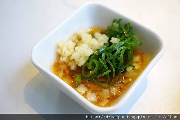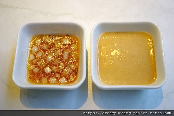 沾醬有2種,右邊的金屋醬跟左邊香檸醬,金屋醬有芝麻香氣,香郁濃厚;香檸醬加了檸檬跟洋蔥,很是清爽。