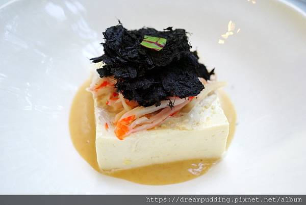 前菜是胡麻松蟹豆腐,記得要跟底下胡麻醬拌勻再吃,豆腐單吃沒味道喔!拌勻之後,搭配沙沙感的紅毛苔還有清爽蟹肉,好開胃。