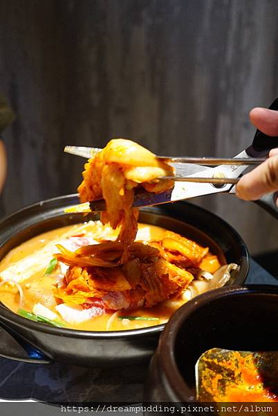 泡菜鍋裡料也不少,一大株泡菜就占了半鍋,泡菜酸辣度適中,還有許多豆腐跟肉,肉品可以選牛或豬,也可加價升級海鮮或是肋排,我們選擇不用加價的牛肉。