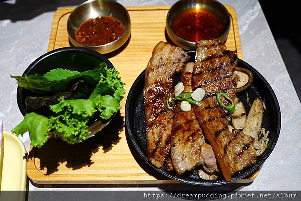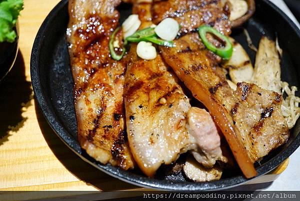 BBQ選項有4種,都不用加價,我們選了豬五花,還有附生菜跟芝麻葉。