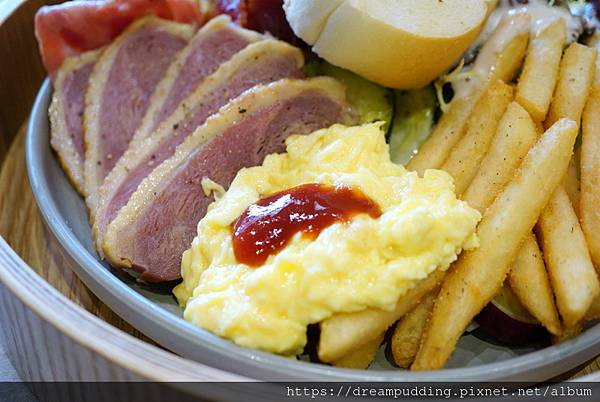 嫩嫩炒蛋也附上番茄醬,薯條外酥內綿鬆不油膩;鴨胸保有肉汁,需搭配麵包一起吃比較不會覺得鹹。