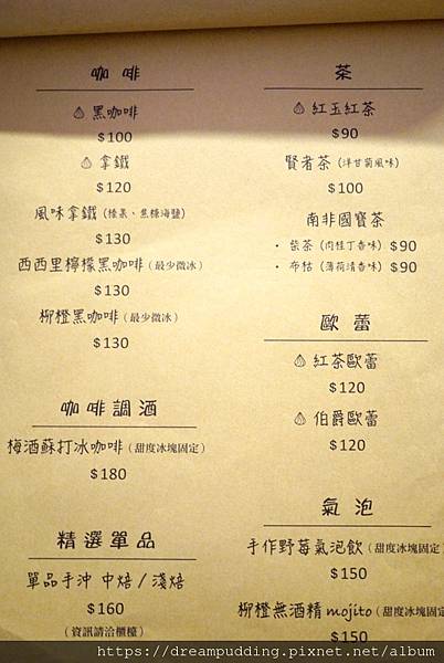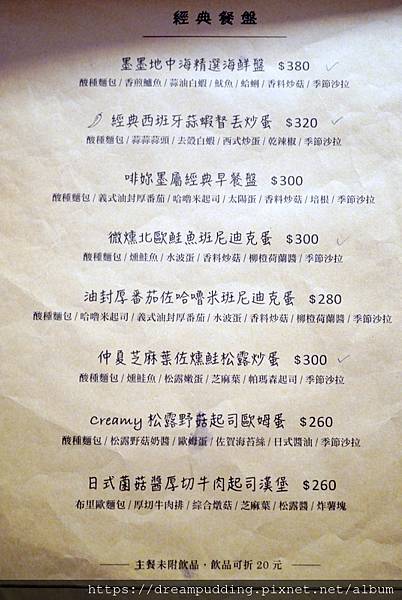 餐點選項也挺多,有早午餐、義大利麵跟燉飯,主餐都沒有附飲品,加點飲料可以折扣;有些當日限定餐點沒在菜單裡,會寫在結帳櫃檯小板板,可以參考。