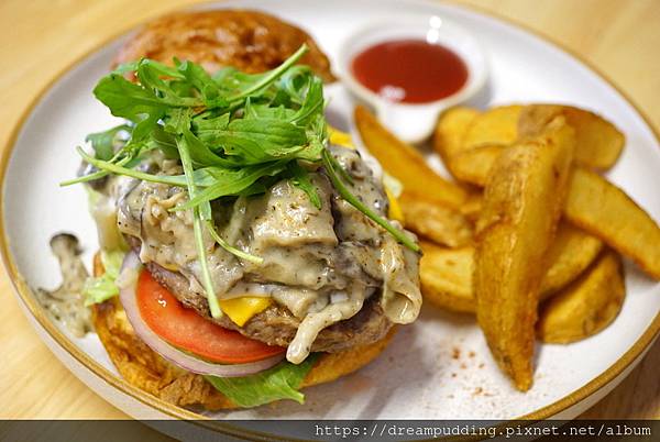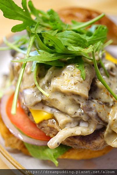 日式菌菇醬厚切牛肉起司漢堡。