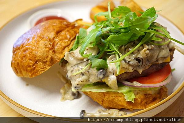 漢堡麵包體採用布里歐麵包,口感蓬鬆柔軟,內餡層層疊疊的嚐起來很有層次感,漢堡肉也有厚度,搭配松露菌菇醬,口感很是不錯。