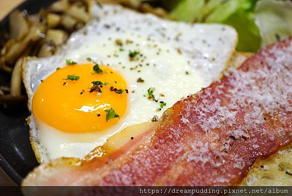 太陽蛋蛋黃飽滿,蛋液沾麵包好讚!培根也煎得恰到好處。