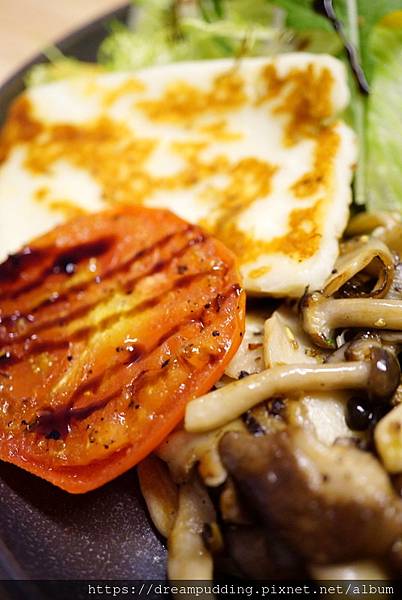 炒菇脆嫩帶汁液,油封番茄潤澤美味,哈嚕米起司口感微鹹也是不錯。