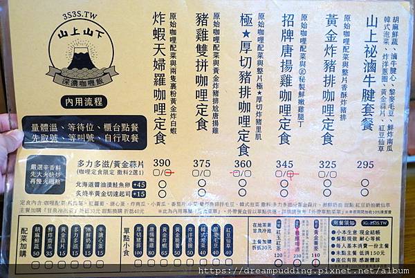 山上山下的生意很好,記得先預約訂位比較保險;這天吃的最喜歡是厚切炸豬排,炸得不油膩又好酥;咖哩是香料味較重的那種,就看個人喜愛度;配菜給的大方又新鮮;甜點好吃。