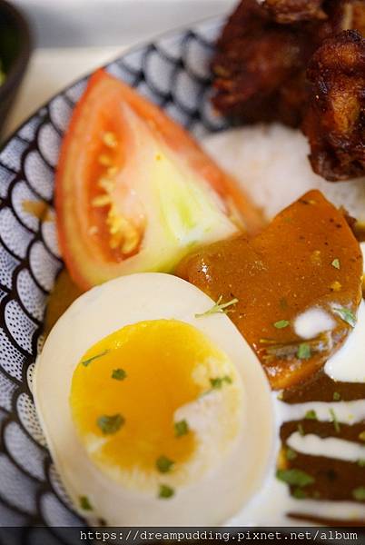 配菜的馬鈴薯、紅蘿蔔跟番茄個頭也都蠻大的;溏心蛋是半顆,這溏心蛋口感軟嫩帶滑,很是好吃。