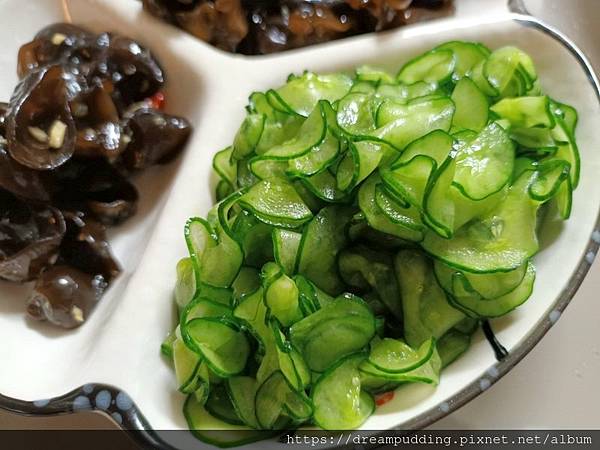 這小黃瓜在盒子裡整個塞好塞滿,倒出來份量挺多,片的好薄,吃起來十分爽脆,酸甘微甜,很是好吃。