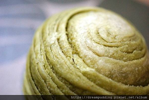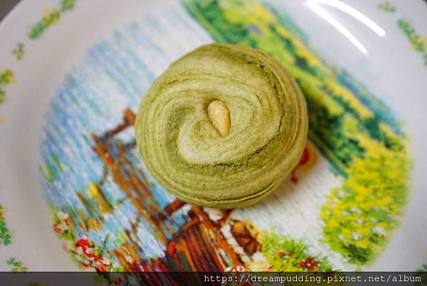 綠色的麻薏餅皮使用榛果奶油及麻薏粉加入麵糰製作。